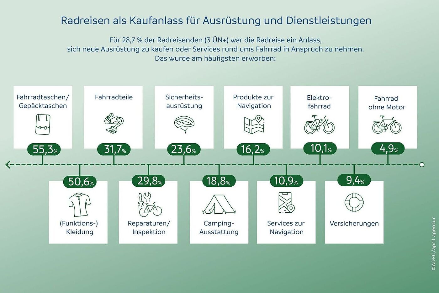 Erstmals wurden im Rahmen der Analyse auch Daten zur Ausrüstung erhoben. Für fast jeden Dritten war die geplante Radreise Anlass, neue Produkte zu kaufen – insbesondere Fahrradtaschen. Darüber hinaus investieren Radreisende in Bekleidung, Fahrradteile sowie Wartung und Service. Davon profitiert auch die sächsische Fahrradwirtschaft.